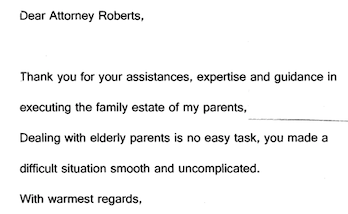 When a family member passed away without a will, Attorney Roberts handled all aspects of her estate (court appointing me her personal representative, real estate sale, payoff of all debts including local, state and federal taxes, etc.). I live out of town and we were able to handle most things by email/phone/fax, preventing me from needing to travel most of the time. I do not hesitate to recommend Attorney. Roberts to anyone who needs help settling an estate.